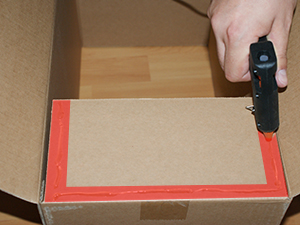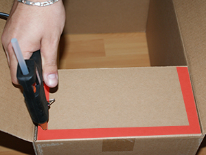 ![]() To ponovimo še na drugi strani škatle. Ko smo nanesli vročo plastiko oz. lepilo, lahko škatlo zalepimo nazaj. Sedaj bo trdna, ko bomo izrezali sredino.