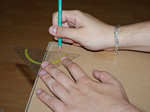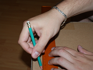 ![]() Z olfa nožem sedaj izrežemo pravokotnike, ki smo jih zarisali. Režemo previdno in počasi, da se škatla ne bi sesedla.