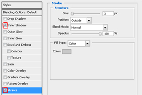 Pod "Blending Options..." moramo imeti obkljukano "Stroke" in "Inner Shadow". Pri Stroke sedaj nastavimo na 3 px. |