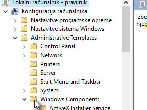 ![]() Nato pa odprite menu Lokalni računalnik - pravilnik, Administratitve Templates in nato Windows Components. |