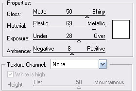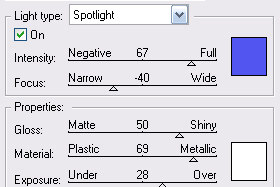 Odpre se novo okno, kjer se malo poigrajte ali pa uporabite moje nastavitve. Light type preko izbirnika določite Spotlight. Jaz sem Intensity nastavil 67 in Focus -40. Potem pa sem nastavil še Gloss na 50, Material 69 im Exposure 28. Ne zaprite še okna.... |