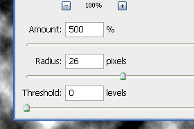 Odpre se novo okno. Amount določite 500 %, Radius 26 pixels in Threshold 0 levels. Kliknite na gumb OK. |