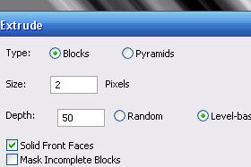 Odpre se novo okno. Type označite Blocks. Site določite 2 Pixels, Depth 50 in označite Level-based. Kliknite na gumb OK. |