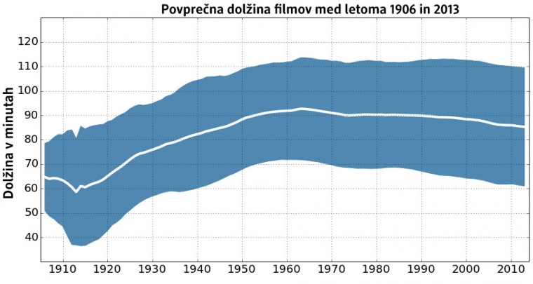 Ali postajajo filmi vedno daljši? Letošnje bombastične uspešnice, kot sta Batman v Superman in X-Men Apocalypse sta bila oba več kot 145 minut dolga, s 146 minutami pa je novi Captain America požel pozitivne kritike, le na račun dolžine ne. Dr. randal Olson se ukvarja z vizualizacijo podatkov, katere pridobi na iMDB filmski bazi podakov. In ugotovil je zanimive podatke, ki obsegajo obdobje med letoma 1931 in 2013. Pa poglejmo: