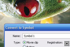 Z orodjem Selection Tool (bližnjica je tipka V) jo označite. Pritisnite tipko F8 in Type določite Movie clip ter kliknite na gumb OK. |