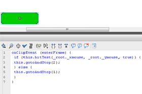 Nato desni klik na Movie Clip in izberite Actions. V polje vpišite naslednjo kodo: onClipEvent (enterFrame) { if (this.hitTest(_root._xmouse, _root._ymouse, true)) { this.gotoAndStop(2); } else { this.gotoAndStop(1); } } |