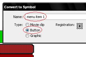 Zdaj kliknite na ozančeni lik z desno miškino tipko in izberite Convert to Symbol...(bližnjica je tipka F8). Za Name(Ime) vpišite menu item 1, pod Type pa izberite Button. Kliknite OK. |