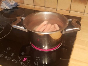 V lonec z vodo postavite toliko hrenovk, kolikor jih boste pojedli ter ga postavite na kuhalno ploščo z nastavljeno najvišjo temperaturo. |