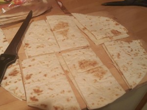 Pripravite tortilje in jih narežite na manjše lističe. Iz ene velike tortilje (ponavadi jih je v vrečki 6) lahko naredite 8 lističev. Vendar je lahko nekomu bolj všeč, če je tortilje več kot manj.