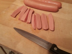 Kuhane hrenovke razpolovite in nato narežite na manjše trakove (glej sliko). |