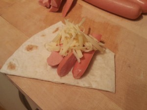 Na pripravljen listič tortilje postavite narezano hrenovko in sir. |