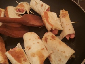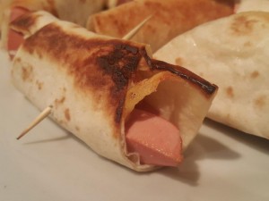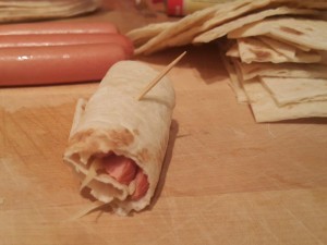 Potem pa tortiljo zavijte skupaj in spnite skupaj z zobotrebcem. To storite tudi za vse ostale hrenovke. |