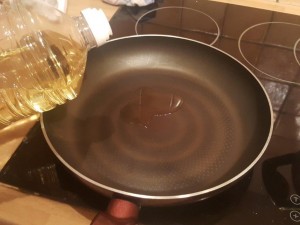 Ko boste pripravili tortilje s hrenovko, pripravite ponev in jo postavite na kuhalno ploščo s srednje nastavljeno temperaturo. Potem pa v njo dolijte malo olja. |