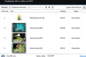 V Izdelovalec DVD-jev ste dodali fotografije, ki so se zaradi lažjega urejanje kategorizirale v Diaprojekcijo in video, ki je vsak zapis ločen.