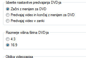 Začni z menijem za DVD pustite označeno. Razmerje višina/širina pa nasavite željeno velikost. Razmerje 16:9 uporabljajo vsi LCD in plazma TV sprejemniki. Tudi v računalniškem svetu je vedno več širokih zaslonov. Če bi radi predvajali DVD na vašem starem TV-ju. označite 4:3. Kliknite na gumb V redu. |