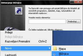 Na namizju kliknemo z desno miškino tipko, izberemo Novo >Bližnjica. Odpre se pogovorno okno...