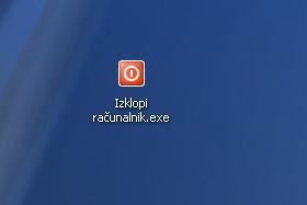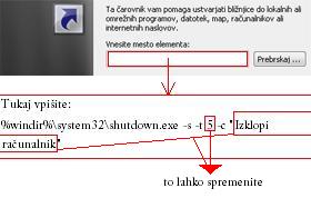 %windir%\system32\shutdown.exe Zraven pripišemo še: -s -t 5 -c Za pojasnitev: prvi ukaz pomeni pot do datoteke(shutdown.exe), drugi ukaz pa, v kolikih sekundah po zagonu bližnjice naj se računalnik izklopi(5). Na koncu v pripišemo še: "Ime bližnjice"; jaz sem napisal "Izklop računalnika" |