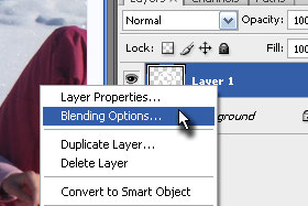 Sedaj pa v plaeti layerjev kliknite z desnim miškinim gumbom na novi layer in izberite Blending Options...