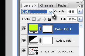 ![]() Sedaj pa nastavitvenemu barvnemu layerju določite senčenje na Darken in Opacity na okoli 45% (glej sliko). |