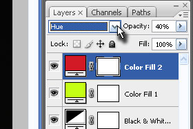 ![]() Sedaj pa nastavitvenemu barvnemu layerju določite senčenje na Hue in Opacity na okoli 40% (glej sliko). |