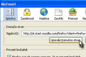 Odprlo se vam je novo okno Možnosti. Kliknite sedaj na gumb Uporabi trenutno stran in v polju Naslov: se vam bo nastavila spletna stran www.zmaga.com (ali poljubna).