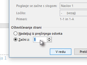 ![]() V novem oknu pod oštevilčenje strani označite Začni z in nastavite številka 1. Kliknite na gumb V redu. |