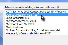 V polju Izberite vrsto datoteke, ki jo želite uvoziti izberite Datoteka osebnih map (.pst) in kliknite na gumb Naprej.
