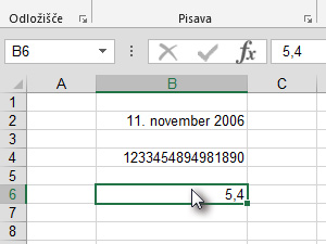 ![]() Številka bo prikazana v celotni obliki, brez decimalnih mest. Kliknite v novo celico in vpišite 5.4 (glej sliko). |