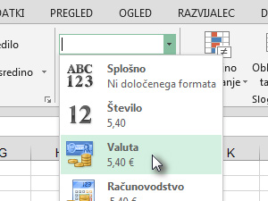 ![]() Kliknite na izbrinik oblike celice in tokrat določite Valuta. |