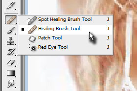 Držite z miško na orodju Spot Healing Brush Tool (bližnjica je tipka J), da se prikažejo ostala orodja. |