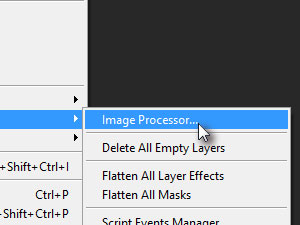 V Adobe Photoshopu kliknite zgoraj na File, Scripts in izberite Image Processor...