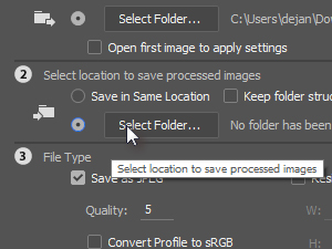 ![]() Potem pod številko 2 kliknite ponovno na Select Folder, kjer boste tokrat določili mapo, kamor naj se shranijo fotografije v JPEG formatu. |