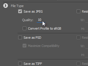 ![]() Pod številko 3 nastavite še format slike na Save as JPEG in Quailty nastavite na 10 ali 12. Lahko nastavljate kvaliteto med 1 in 12. |