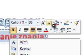 Kliknite na označeno besedilo z desnim miškinim gumbom in klikajte na ikono, ki predstavlja pomanjšanje besedila (glej sliko).