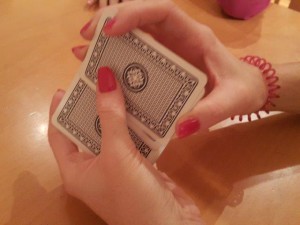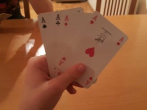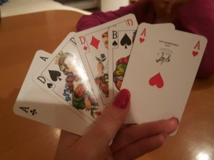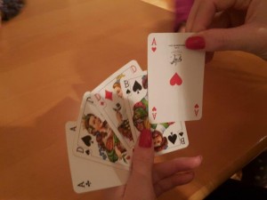 ![]() Cilj igre je, da zberete vse štiri vrste karte enake vrednosti. Vzemite karto, katere ne želite zbirati. V mojem primeru imam dva asa, dve dami in enega fanta. |