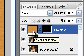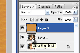 Držite tipko CTRL in kliknite na prej dupliciran layer (glej sliko). Layer z prelivom mora ostati označen. |