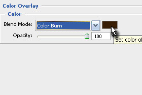 Blend Mode določite Color Burn in potem kliknite na izbrinik barve (glej sliko). V izbirniku barve v polje # vpišite 361c01 in kliknite na gumb OK in nato še enkrat, da zaprete okno. |