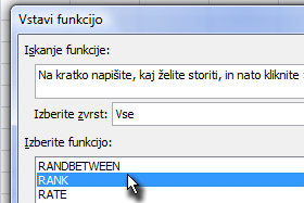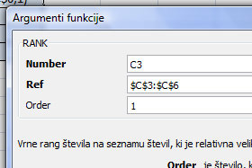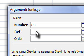 Polje Izberite zvrst preko izbirnika določite Vse, potem pa v polju Vstavite funkcijo poiščite in označite RANK. Kliknite na gumb V redu. |