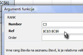 V mojem primeru je to $C$3:$C$6. Če znaka $ ne bi vnesli, bi Excel pri naslednjih celicah imel napačne podatke, tako pa smo jih fiksirali. Poizkusite brez znaka $. |