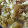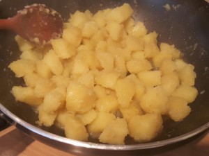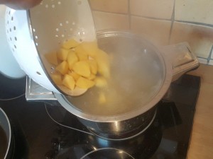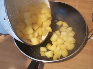 Kuhan krompir precedite in ga nato postavite v posodo, kjer se nahaja prej precejeno olivno olje. Če je krompir dovolj kuhan, preverite tako, da ga z nožem poskusite prerezati. Če gre enostavno, je kuhan, v nasprotnem primeru pa še malo počakajte. |