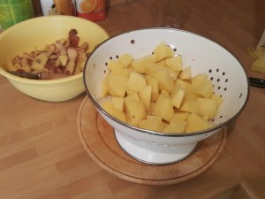 Potem pa v vrelo vodo dodajte še prej pripravljen krompir v koščkih. |