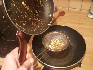 Vse skupaj mešajte toliko časa, dokler ne bo česen postal rumenkaste barve, potem pa precedite olivno olje v neko večjo posodo, rožmarin in česen pa pustite v cedilu. |