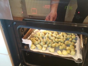 Čez približno 20 minut krompir v pečici malo premešajte, da se bo dobro popekel z vseh strani. |