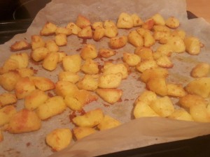 In ga potem postavite na pekač in papir za peko. Krompir dobro razporedite in ga dajte peči v pečico z nastavljeno temperaturo 220 stopinj Celzija. Pečico lahko že 10 minut prej segrejete, če želite.