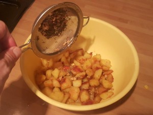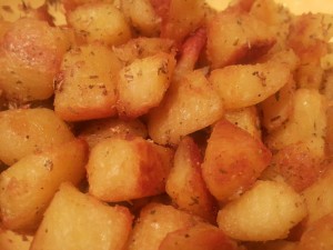 Ko bo krompirček dovolj pečen z vseh strani, ga postavite v neko posodo in dodajte rožmairn in česen iz cedila. Premešajte in nato dodajte še sol in poper. |