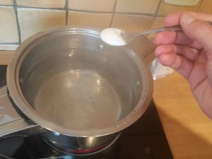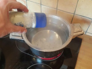 Potem vzemite posodo, vanjo nalijte vodo in jo dajte kuhati na največji temperaturi. Ko bo voda zavrela, jo posolite. Jaz sem dodal približno tri žličke soli.