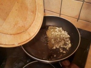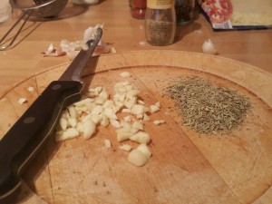 Med kuhanjem bomo pripravili še začimbe. Vzemite tri stroke česna in ga nasesekljajte ter pripravite štiri ščepce rožmarina.