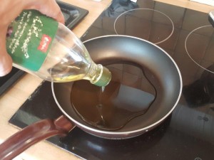 V ponev nalijte približno pol decilitra olivnega olja in jo postavite na kuhalno ploščo z nastavljeno srednjo jakostjo. |