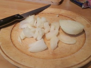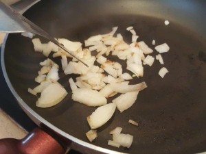 Na ponev postavite še narezano čebulo in jo malenkost popecite. |