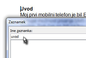 V polje Ime zaznamka vpišite ime podnaslova, za katerega ustvarjate zaznamek. Jaz sem vpisal uvod. Ne uporabljajte presledkov! Kliknite na gumb Dodaj. |
